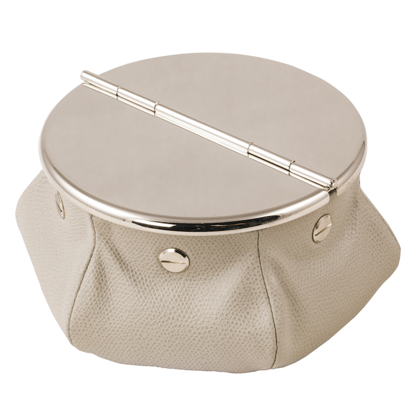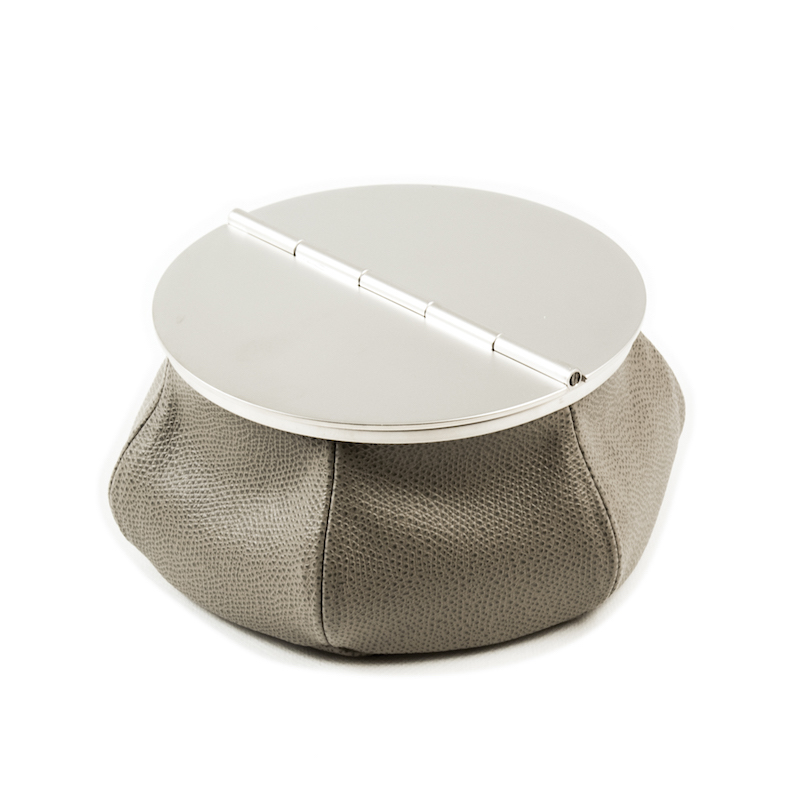 Handvervaardigde, windbestendigde asbak van messing palladium, bevestigd op een leren zak, gevuld met 1 kg. metalen micro balletjes.