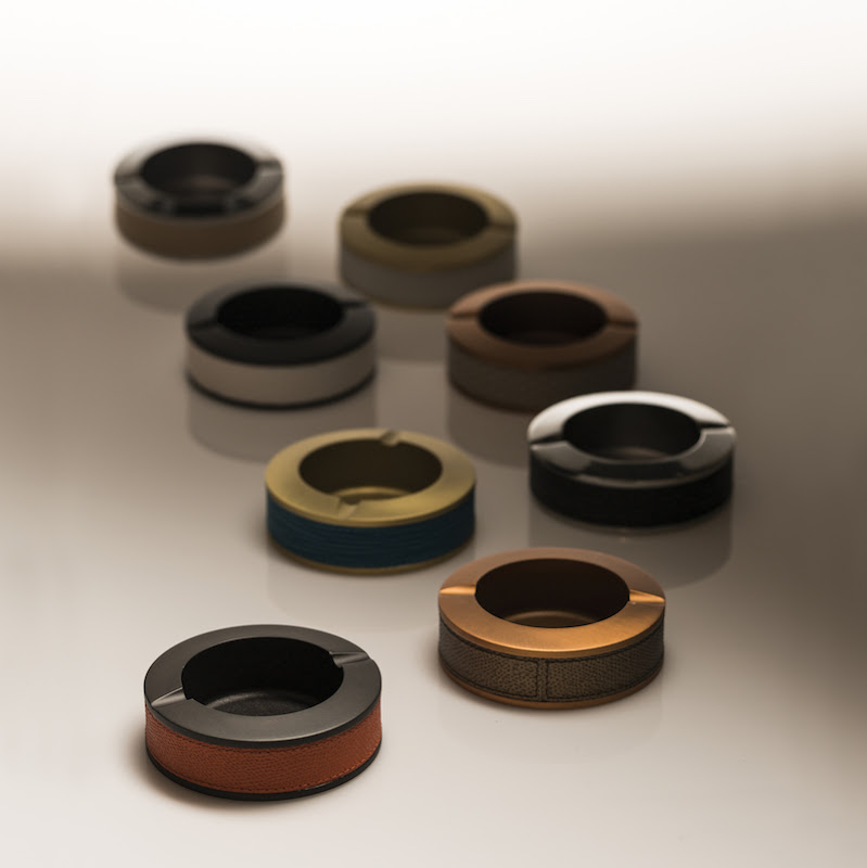 Asbak gemaakt van een zwaar, solide blok metaal waarvan de rand en bodem bekleed zijn met leer.