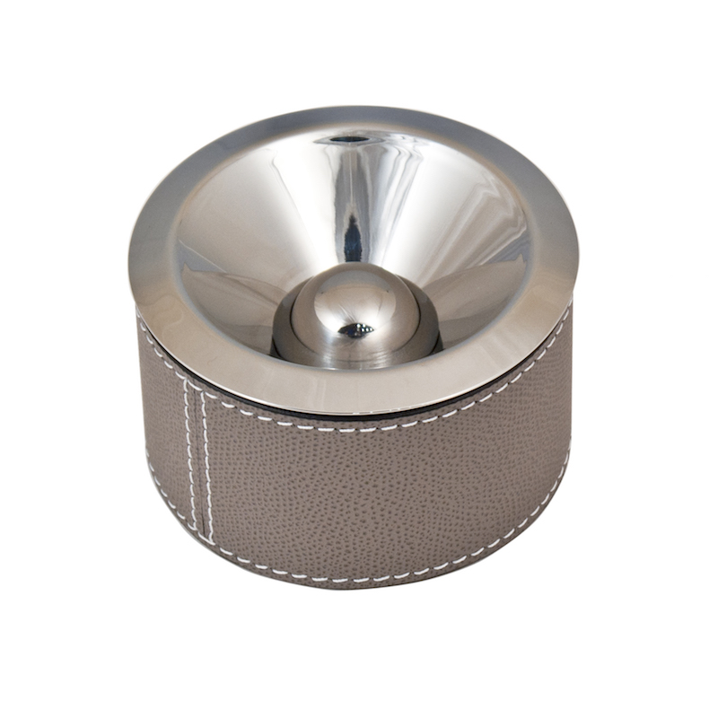 Gepolijst roestrvrijstalen asbak in met leer beklede houder.