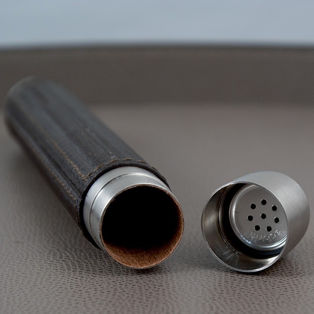 Deels met leer beklede sigaarkoker, gemaakt van gesatineerd roestrvij staal.