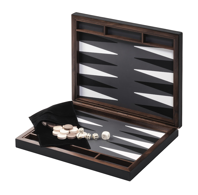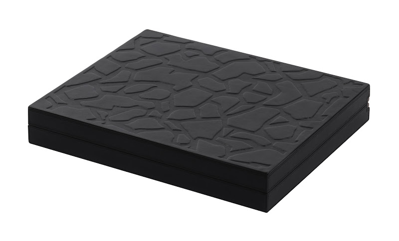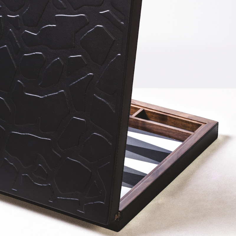 De doos is alleen leverbaar in zwart nappaleer, maar het met leer ingelegde speelvlak kan, indien gewenst, in andere kleuren worden uitgevoerd.