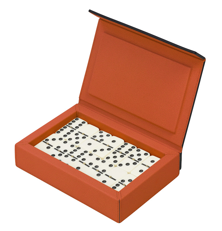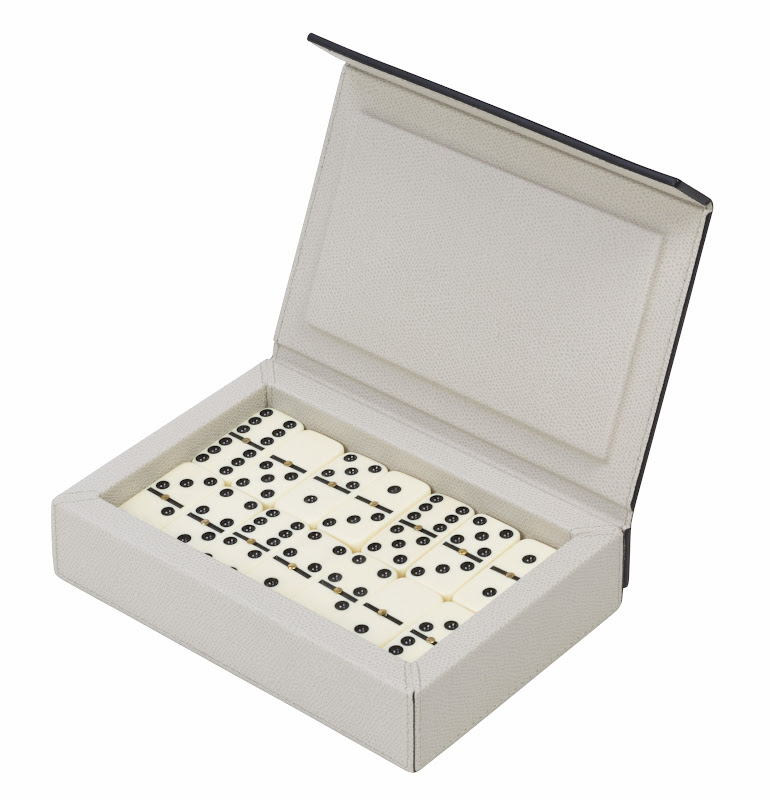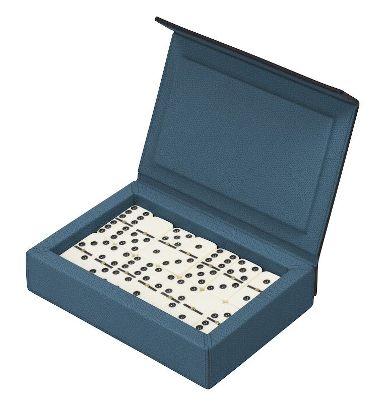 De doos heeft een magnetische sluiting en bevat 1 set bakelieten dominostenen van hoogwaardige kwaliteit.