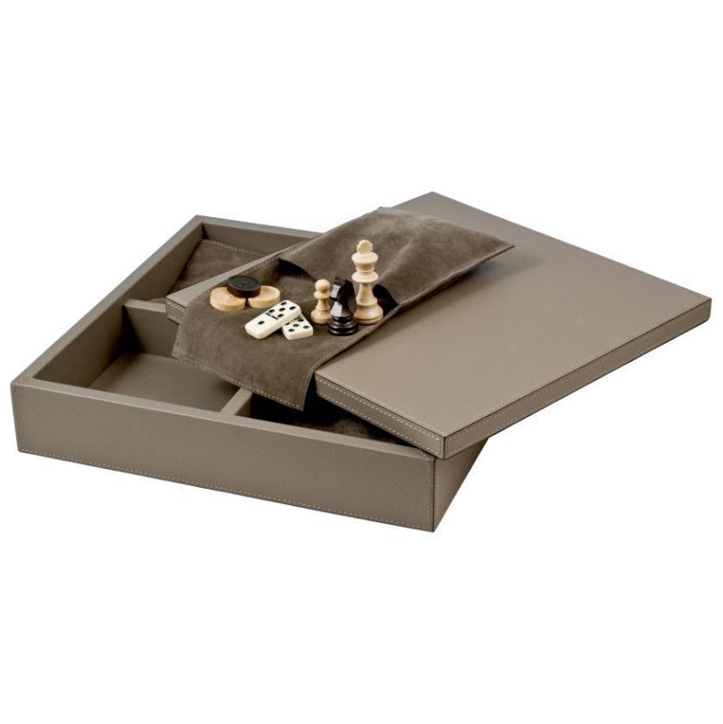 Met leer beklede houten doos. Het speelvlak is ingelegd met leer.