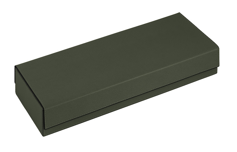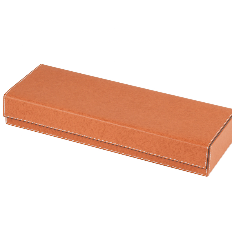 Met leer beklede houten doos met scharnierend deksel en magneetsluiting.