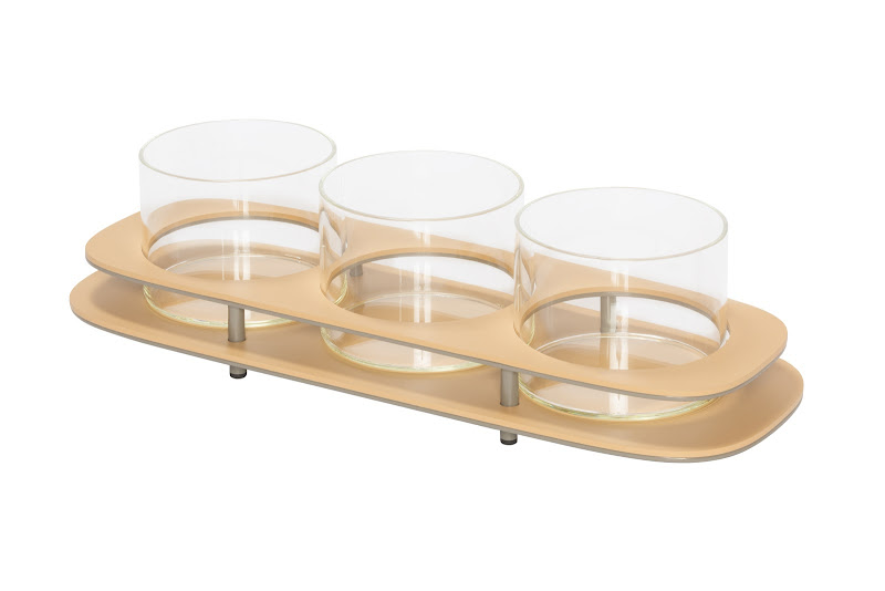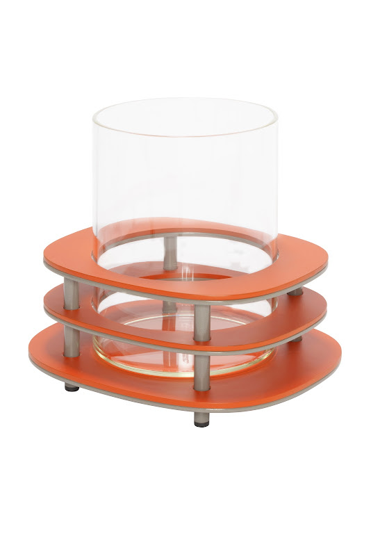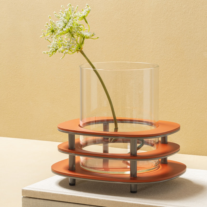 Kandelaar/Vaas opgebouwd uit 2 - 3 ringen Tecnocuoio® leer met gepolijst chromen pootjes en hittebestendig, uitneembaar glas.
