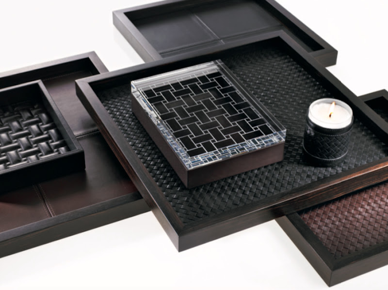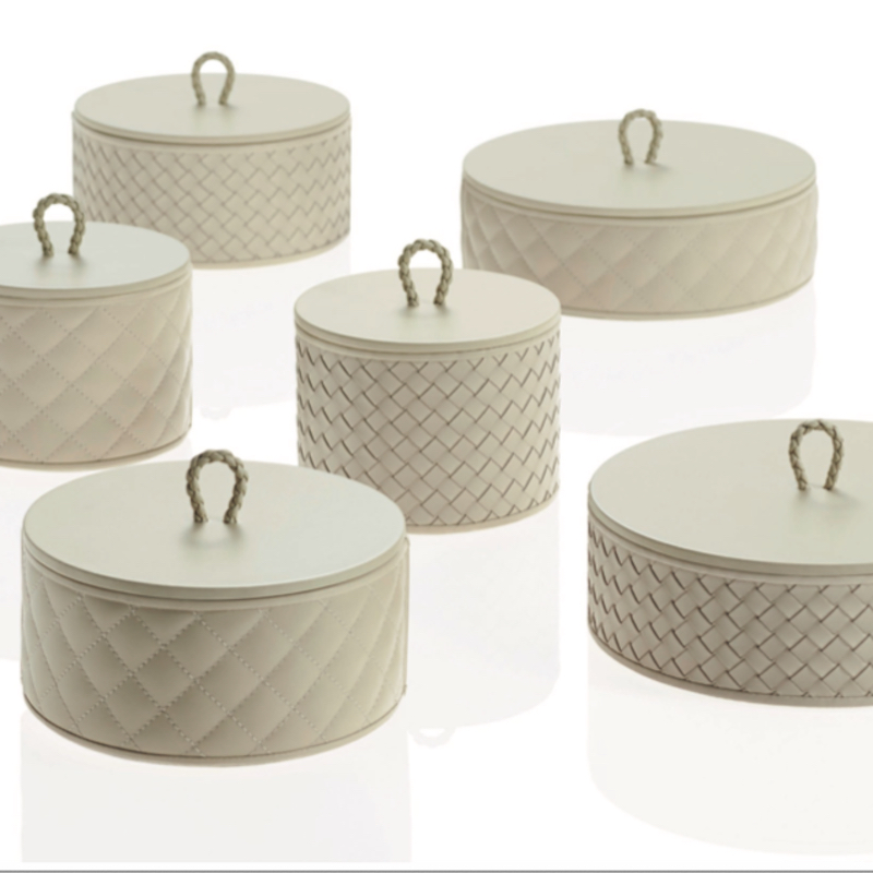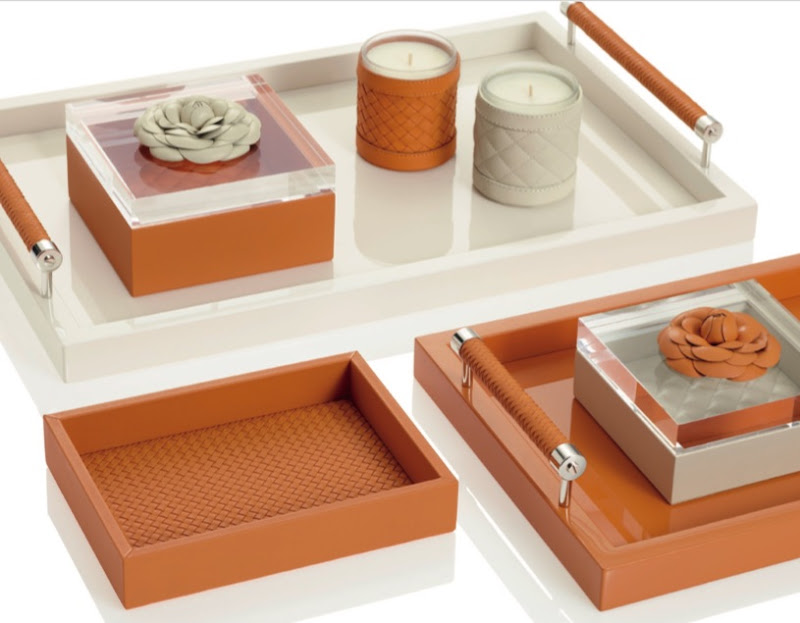 Diverse woonaccessoires gemaakt van kalfsleer, soms in combinatie met andere materialen.