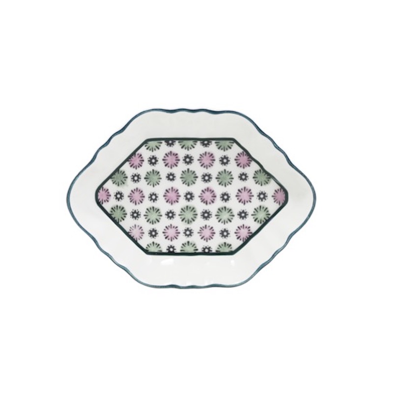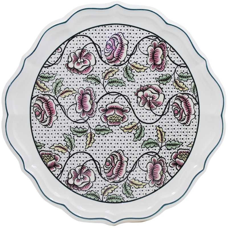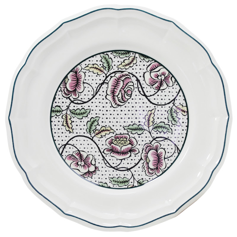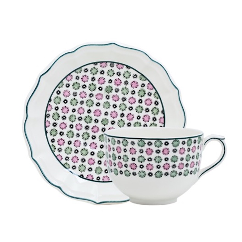 Dit decor is het resultaat van een samenwerking met een jong team van 'dominoté' behangontwerpers. Bloemen en geometrische vormen versieren de sierlijke vormen van dit servies.