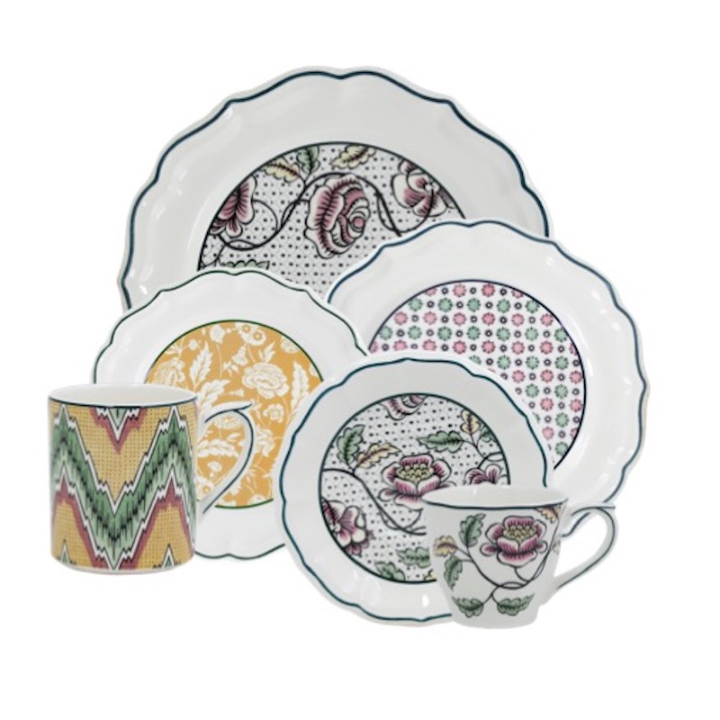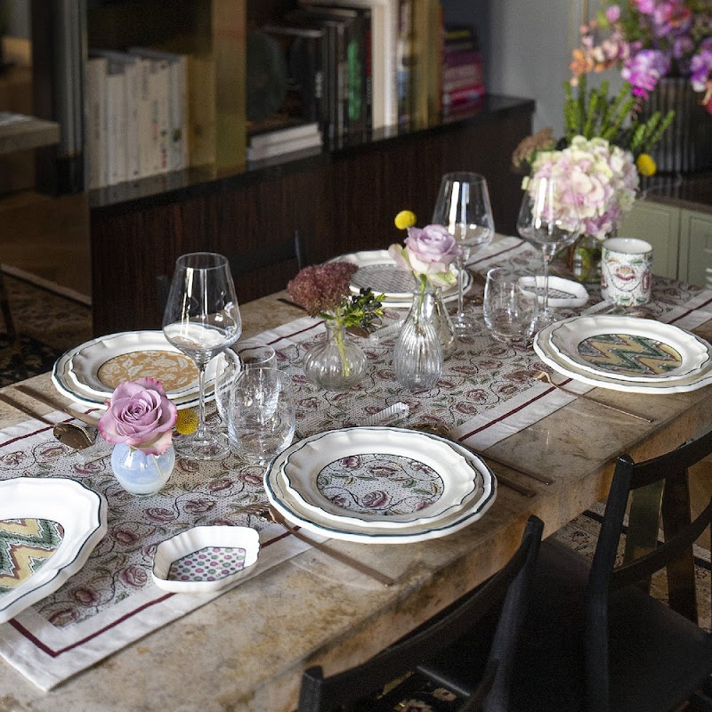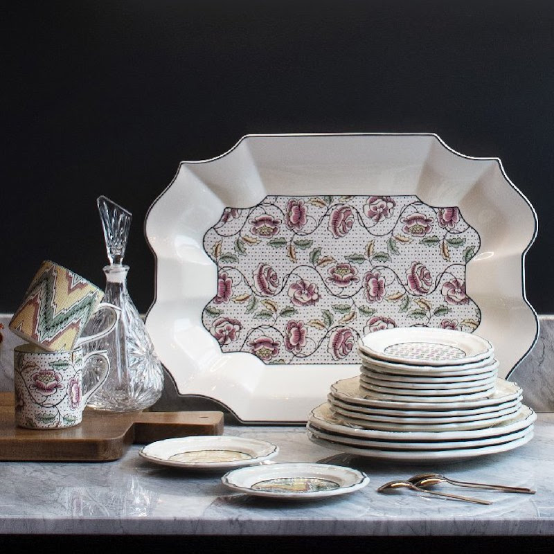 Dit decor is het resultaat van een samenwerking met een jong team van 'dominoté' behangontwerpers. Bloemen en geometrische vormen versieren de sierlijke vormen van dit servies.
