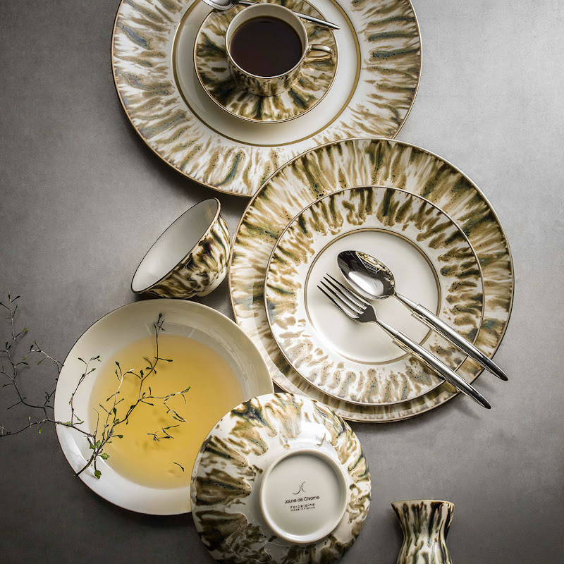 Jaune de Chrome is vermaard om het exclusieve glazuur vakmanschap. Metaaldeeltjes worden, vermengd met glazuur, nauwkeurig op het porselein aangebracht, waarna het brandingsproces in de oven de ruwe materialen transformeert. Hierdoor is ieder stuk uniek en nooit helemaal hetzelfde, maar ook niet echt anders.