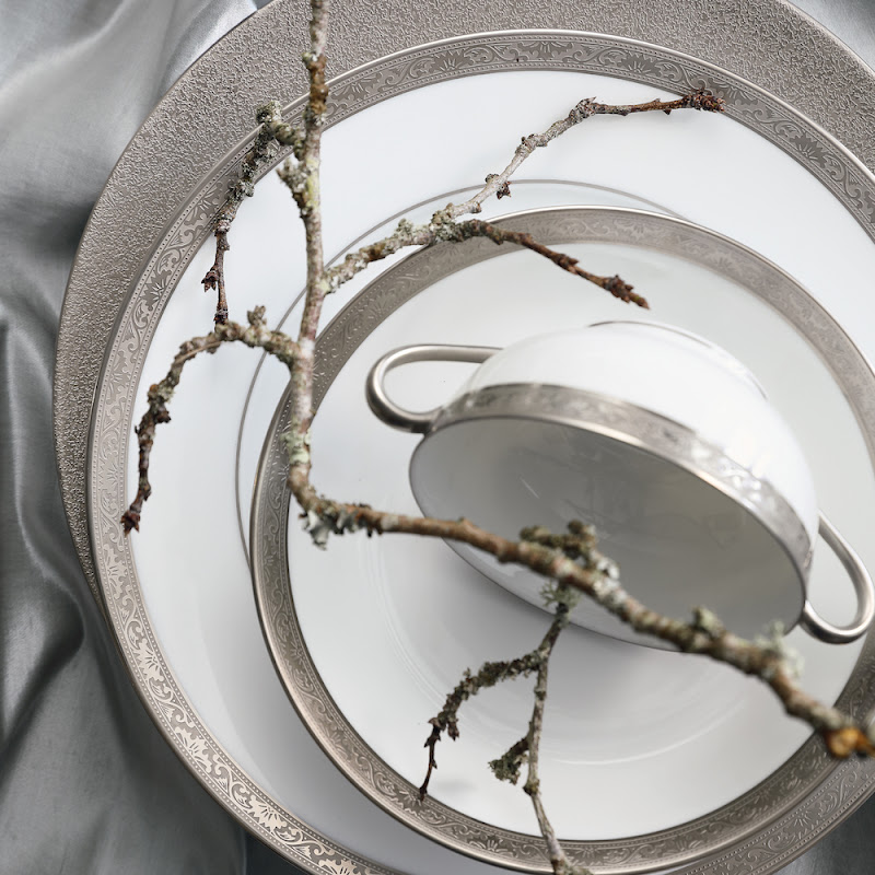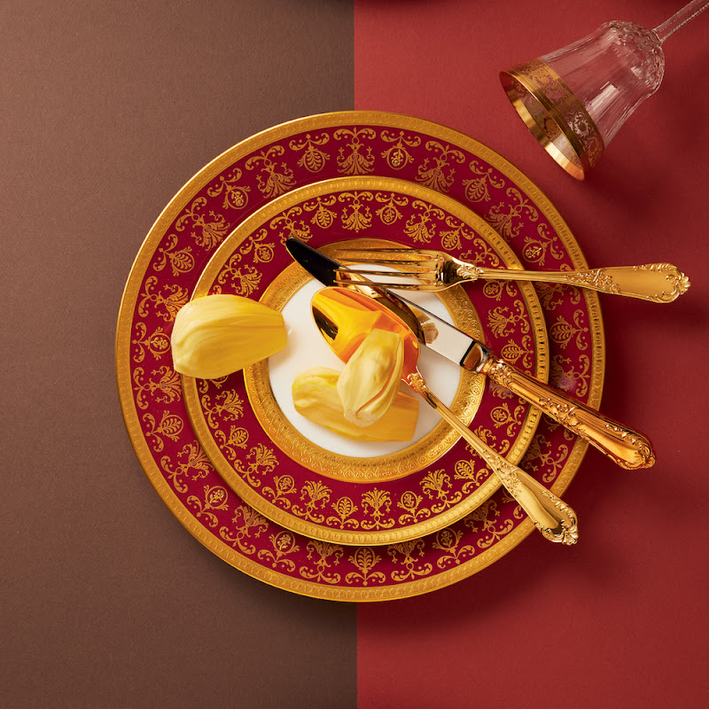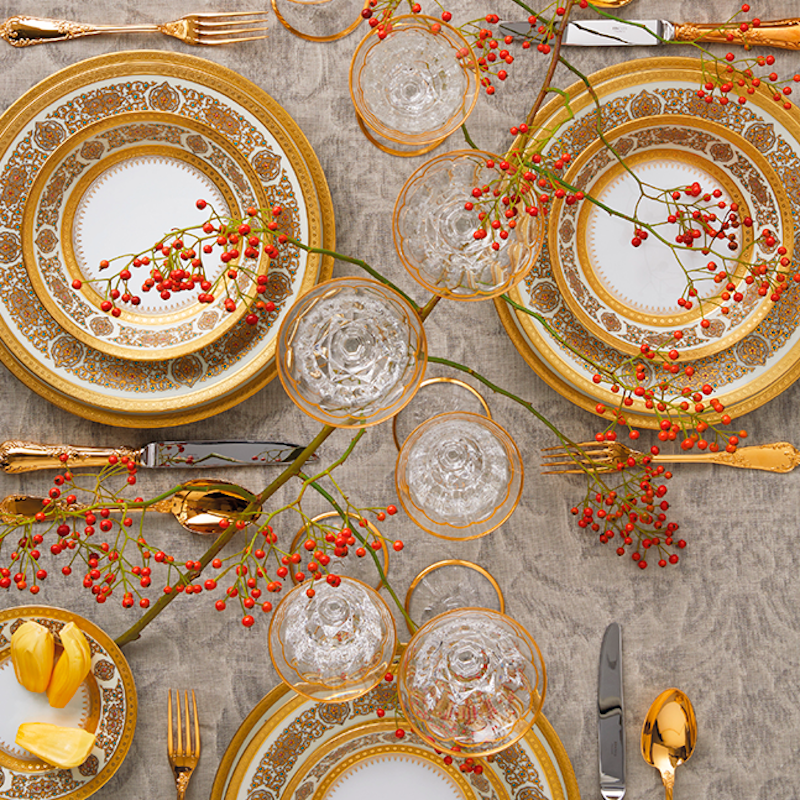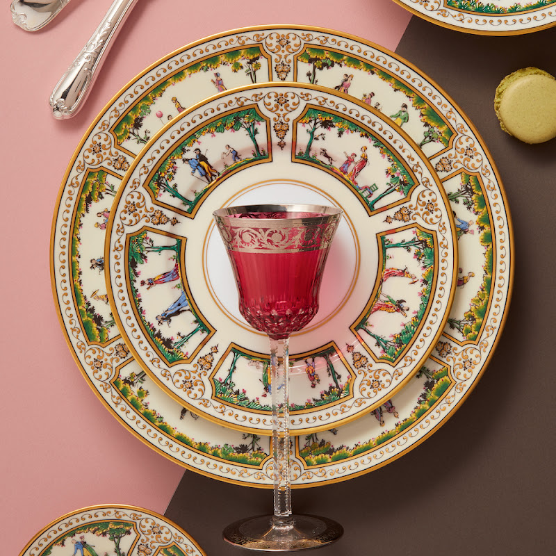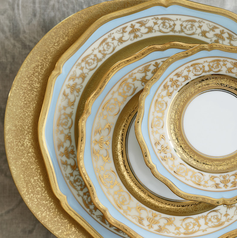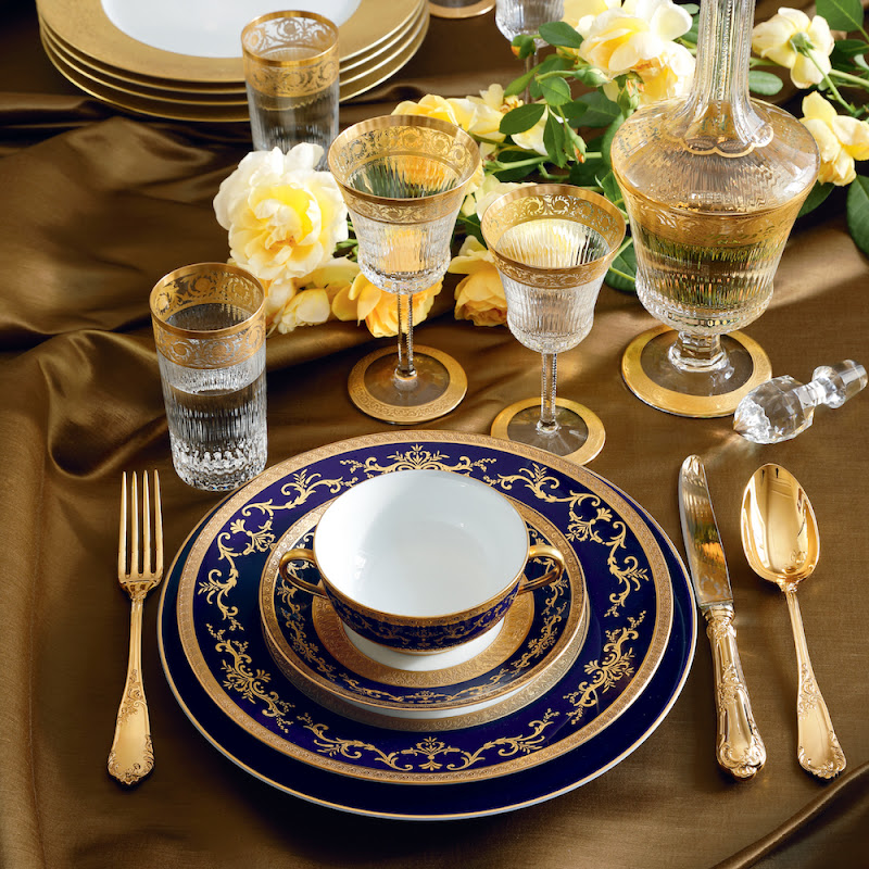 Een collectie van exclusieve serviezen gemaakt van Limoges porselein en voorzien van rijke decors, afgewerkt met goud of platina