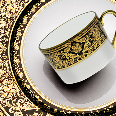 Een her-uitgave van een origineel decor uit 1880. Rijk gedecoreerd in reliëf met diverse lagen goud of platina welke met de hand worden aangebracht