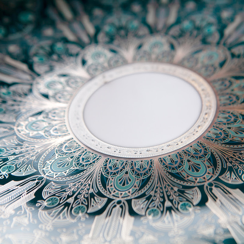 Decor geinspireerd op oude Egyptische motieven en verfijnd met platina reliëfrand welke vaatwasmachinebestendig is