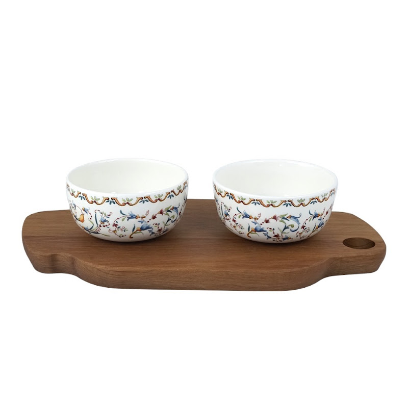 | Aperitief set, 2 dipschaaltjes op houten plateau