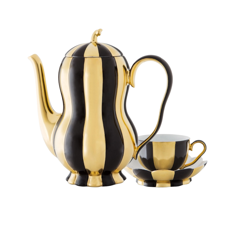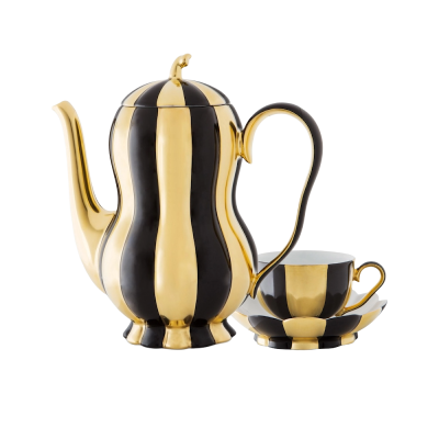 Het exotische van de fruitvormen met de speelse knop en de prettig in de hand liggende handgrepen, waarvan de zacht golvende vorm de geribbelde wanden van de potten elegant weerspiegelt, kenmerken het charisma van dit servies.