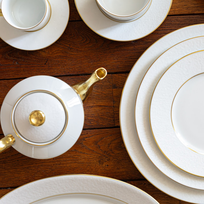 Moonscape is eveneens leverbaar in uni wit, of gedecoreerd met platina filetrand. Een combinatie met Moonscape Premium Or geeft uw gedekte tafel een luxe uitstraling