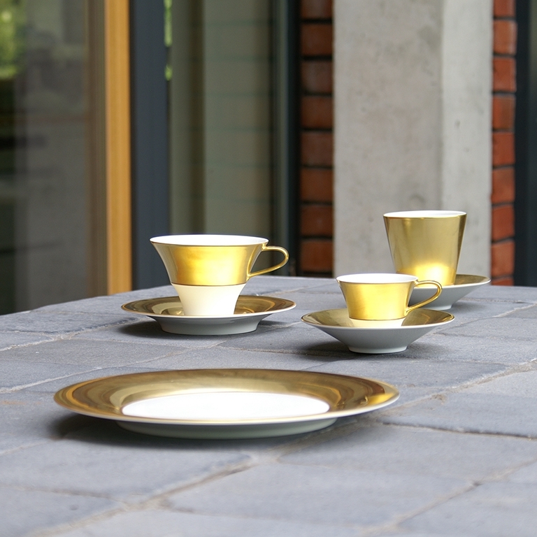 Porselein, voorzien van gepolijst goud en handgeschilderde chocalade bruine bies