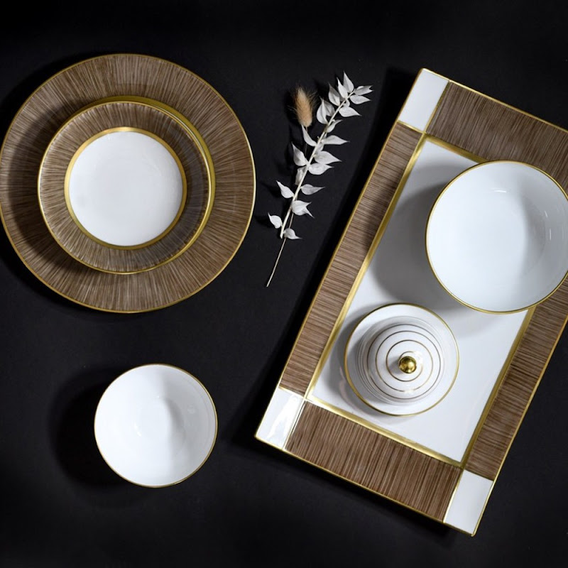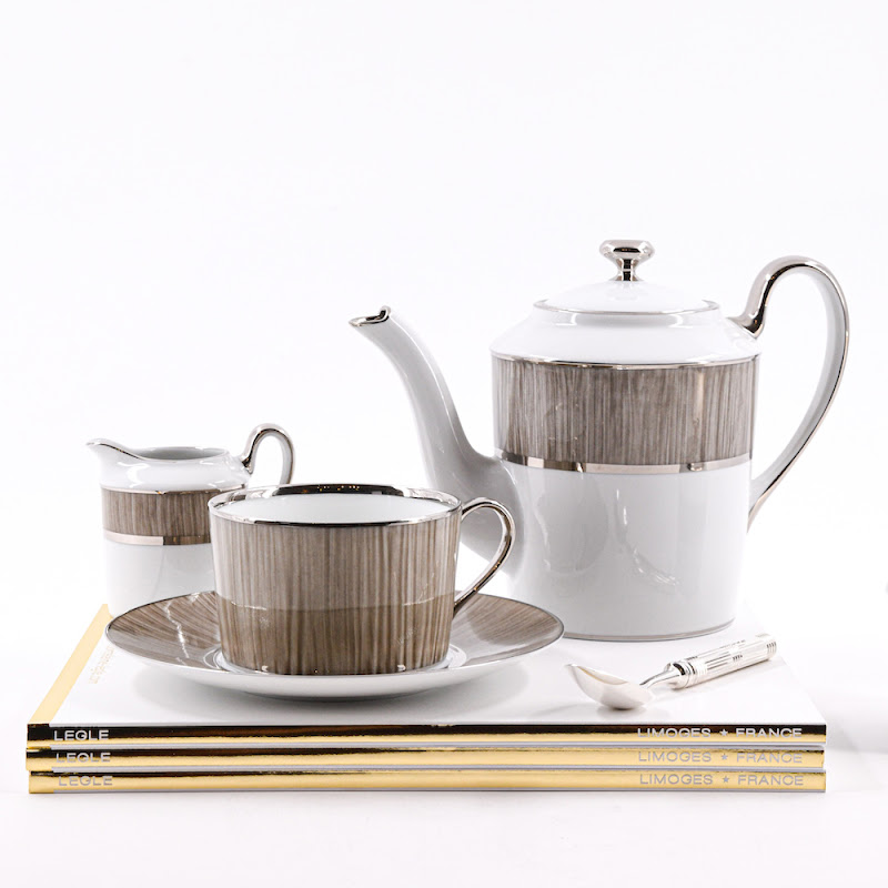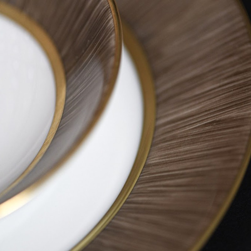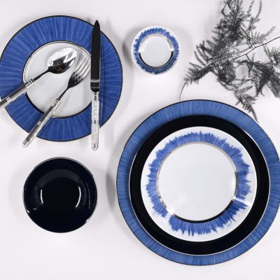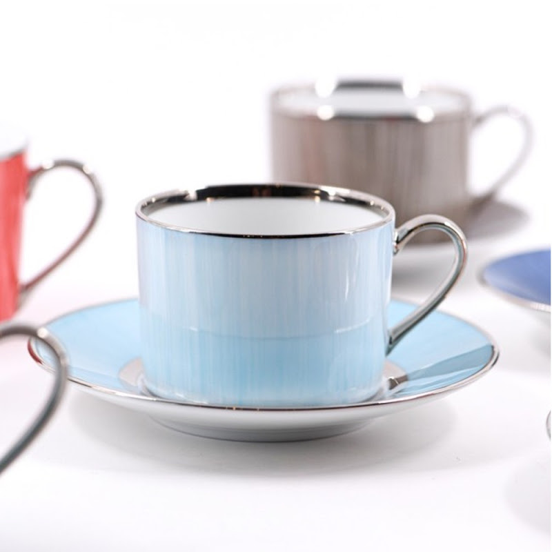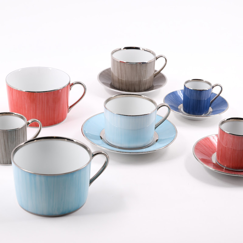 Dit servies is handbeschilderd en leverbaar in 5 kleuren en met een mat gouden of glanzende platina afwerking