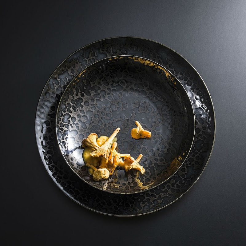 Jaune de Chrome is vermaard om het exclusieve glazuur vakmanschap. Metaaldeeltjes worden, vermengd met glazuur, nauwkeurig op het porselein aangebracht, waarna het brandingsproces in de oven de ruwe materialen transformeert. Hierdoor is ieder stuk uniek en nooit helemaal hetzelfde, maar ook niet echt anders.