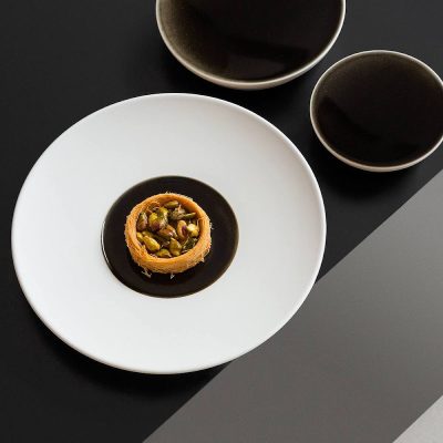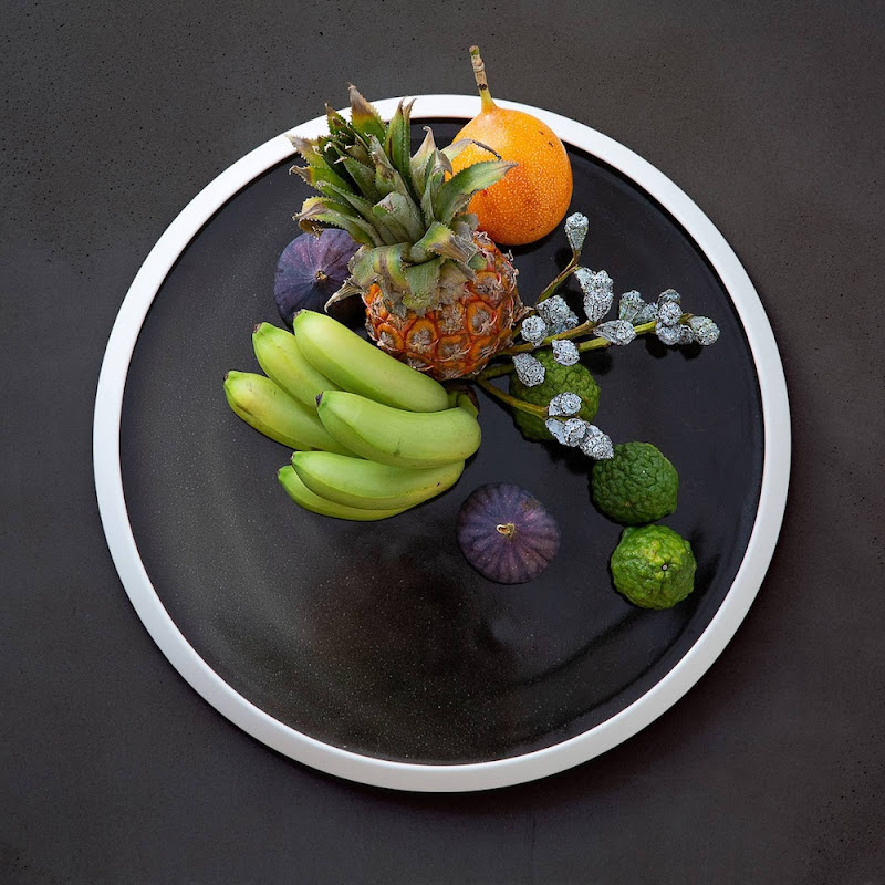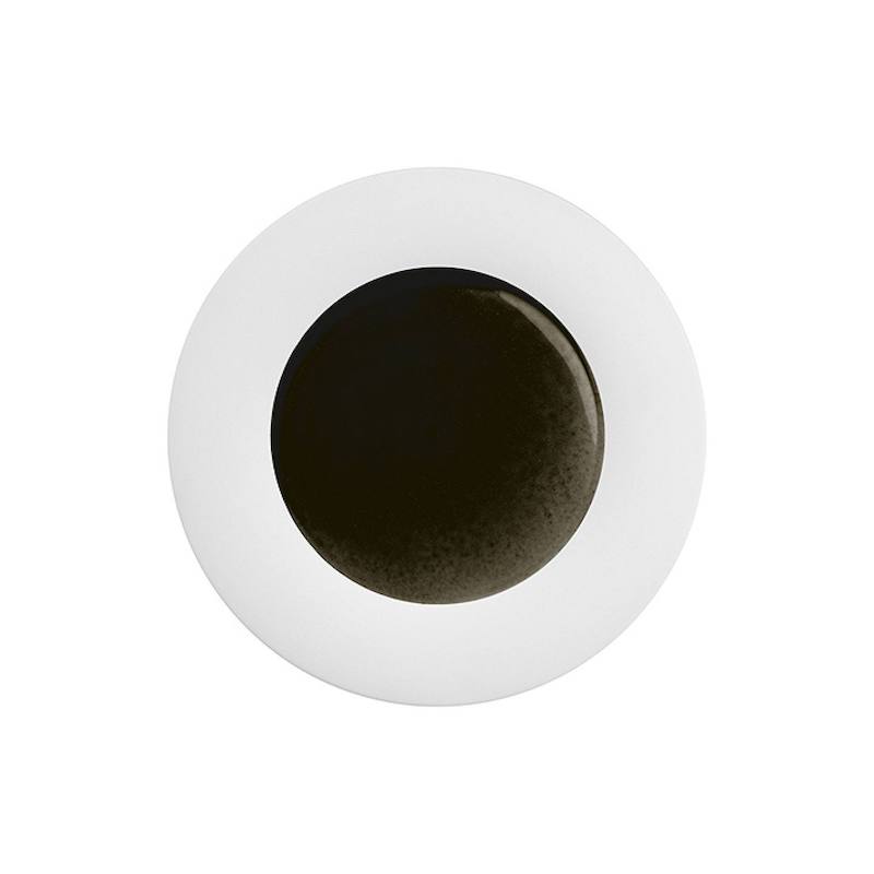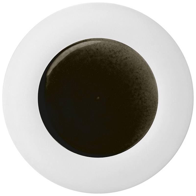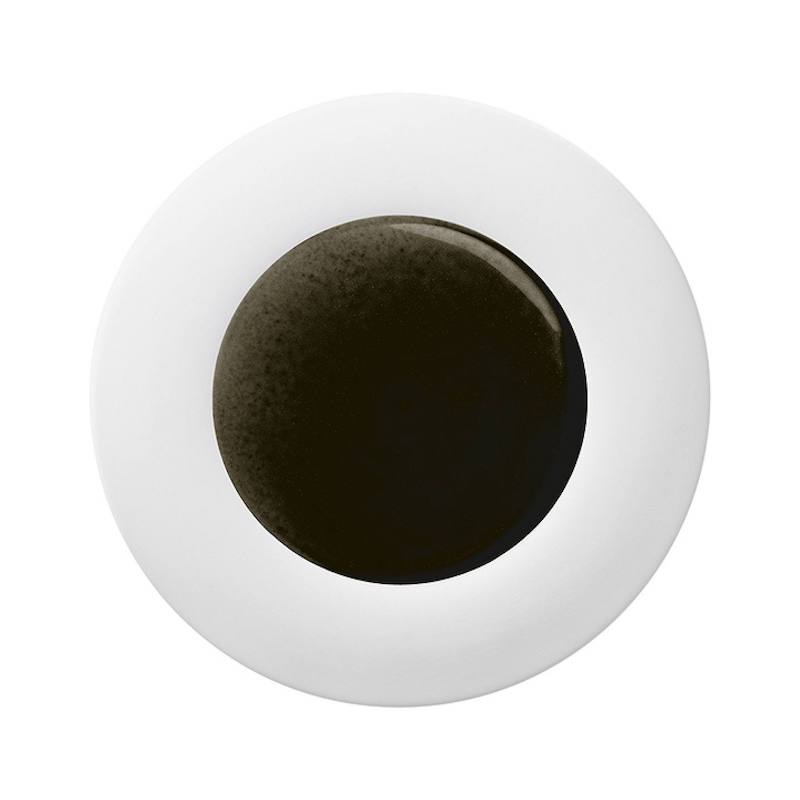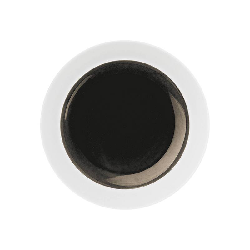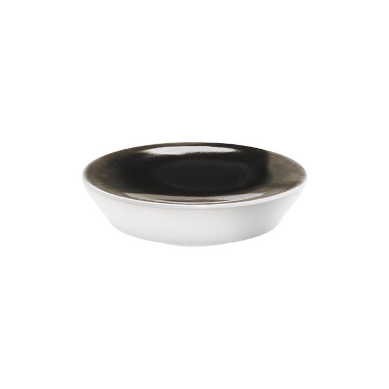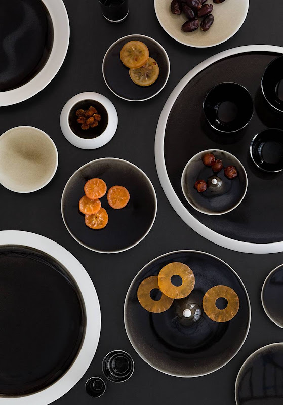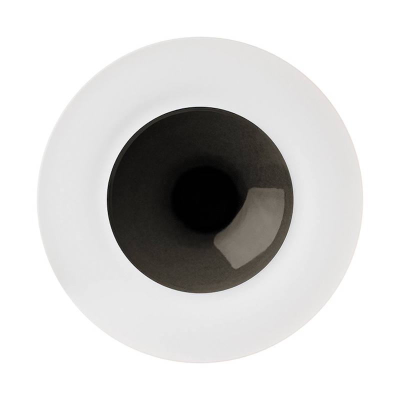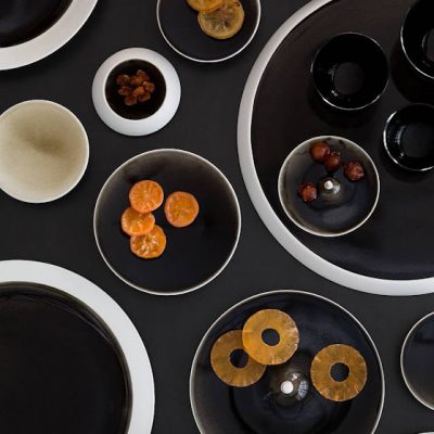 Biscuit porselein, waarbij de spiegel gedecoreerd wordt door een met de hand aangebrachte zwarte glazuur. Dit procedé zorgt ervoor dat ieder serviesdeel uniek van kleur is