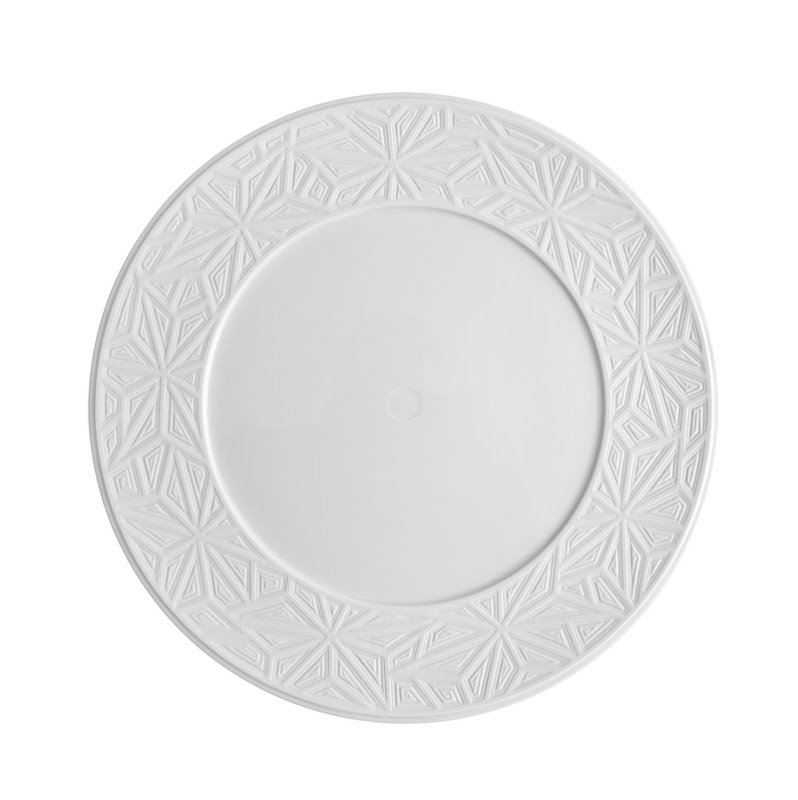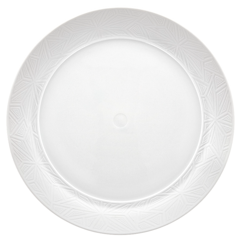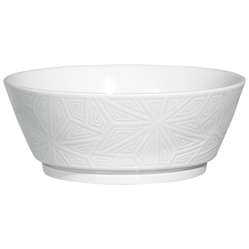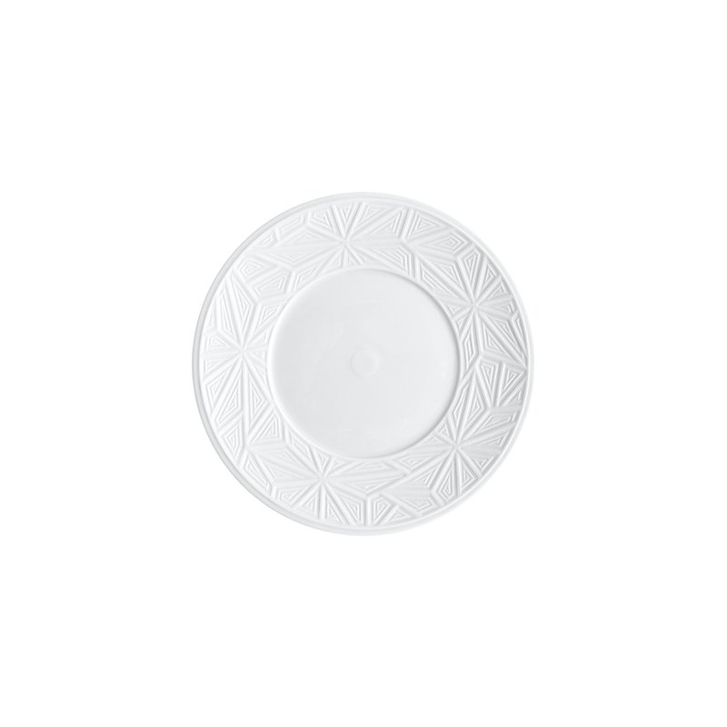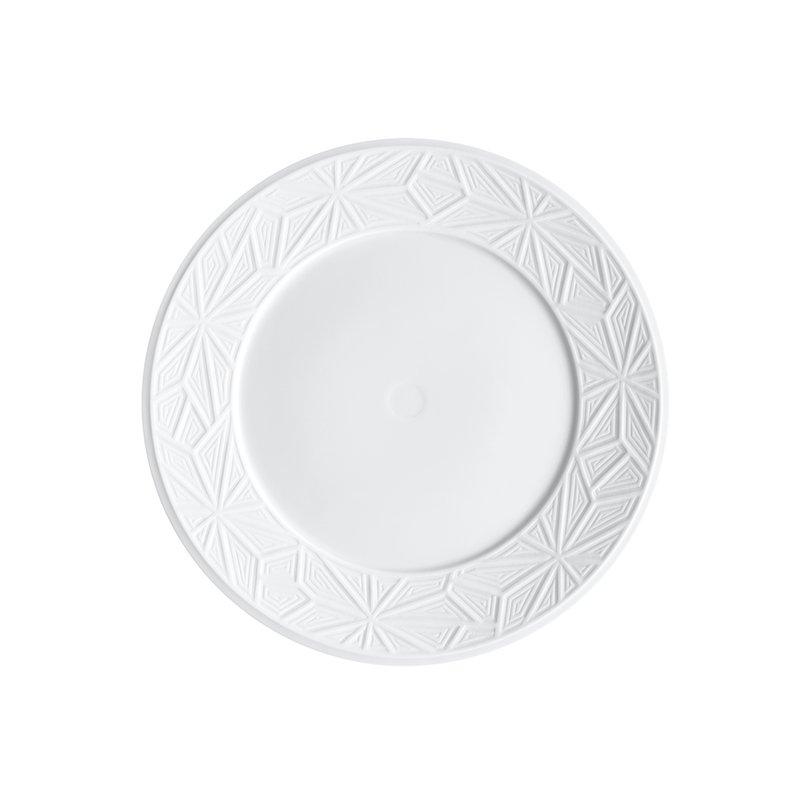 Porselein met een ongeglazuurde (Bisquit) rand waardoor het grafisch reliëf helder en scherp tot zijn recht komt. Het Japanse Katagami is de inspiratie geweest voor dit decor