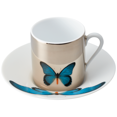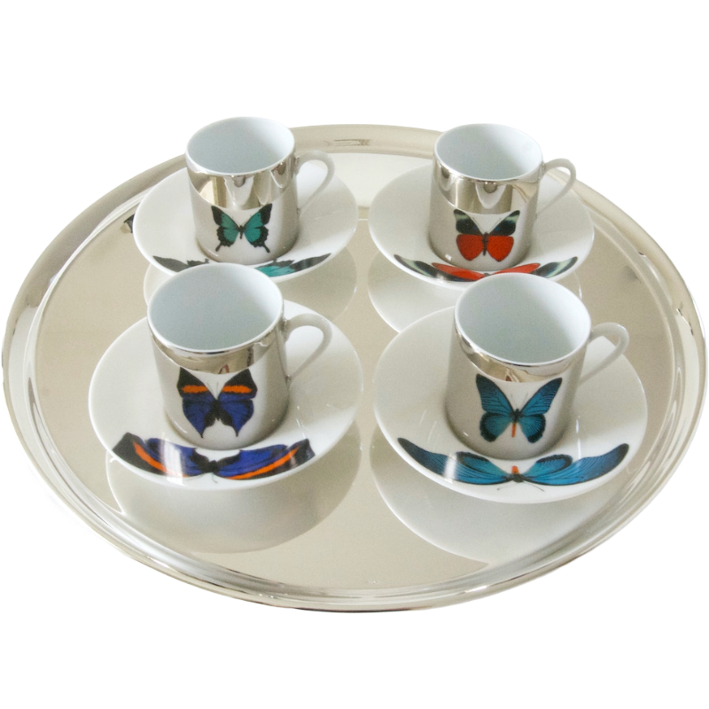 Set van 4 espressokop en schotels met platina kopje en schotel met afbeelding van een vlinder