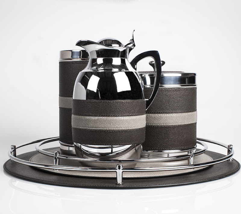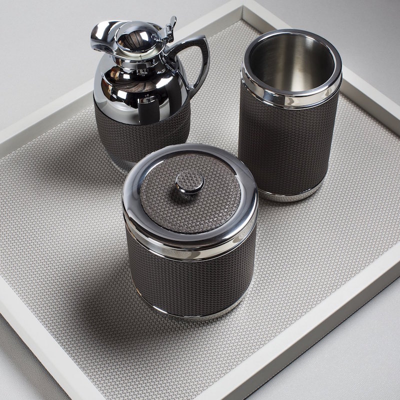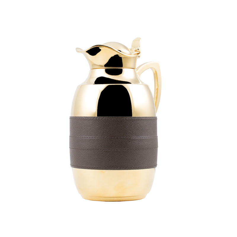 Deels met leer beklede, gepolijst roestvrijstalen isolerende kan.