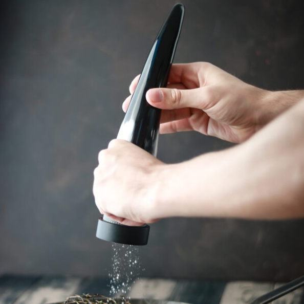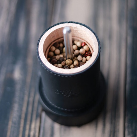 De basis is van hout, bekleed met leer, grijs voor zout en zwart voor peper
