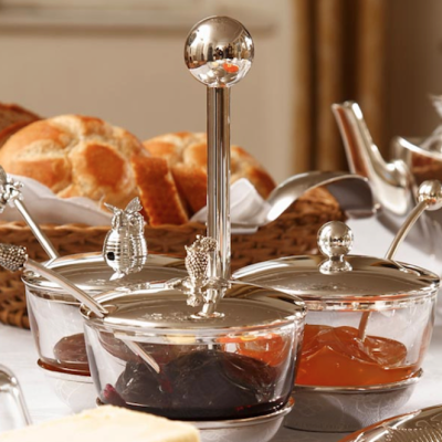Set bestaande uit 3 glazen jampotjes met verzilverde deksel in een verzilverde houder.