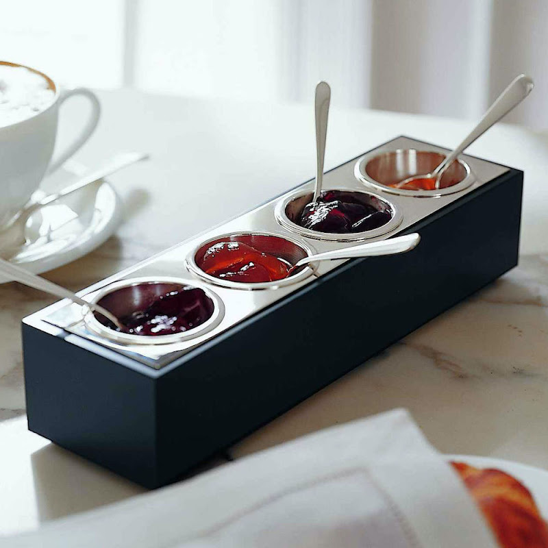 In de verwijderbare potjes kunnen jam, suiker, maar ook sausjes worden geserveerd. Er is ook een kleinere versie voor verschillende soorten zout