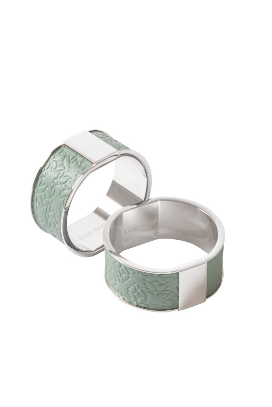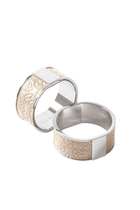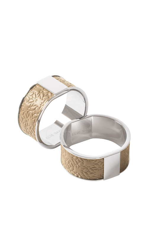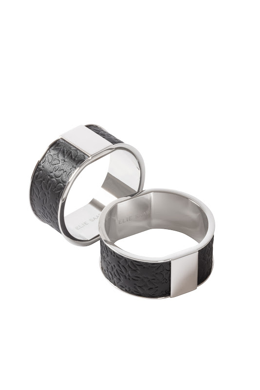 Set van twee servetringen, gemaakt van gepolijst palladium, bekleed met leer voorzien van het ELIE SAAB monogram patroon.