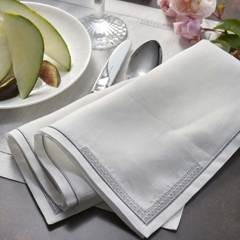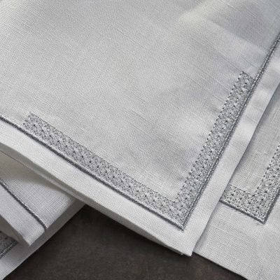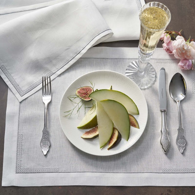Place-mats, servetten en tafelkleden worden in de gewenste stof en met de borduring in een kleur naar keuze speciaal op maat gemaakt.